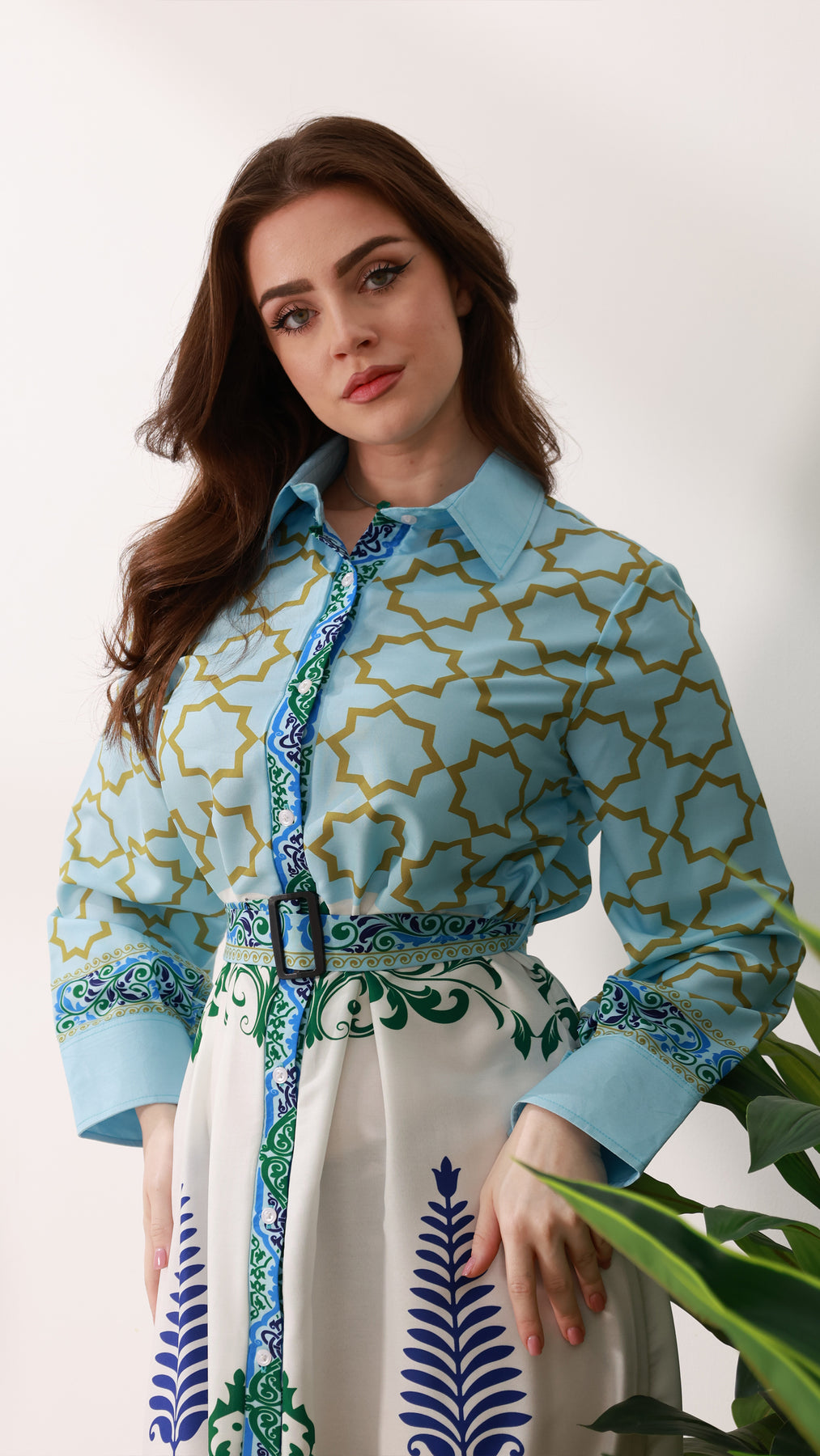 Neckline & Sleeves: Classic collared neckline paired with long sleeves and structured cuffs adds a touch of timeless sophistication.