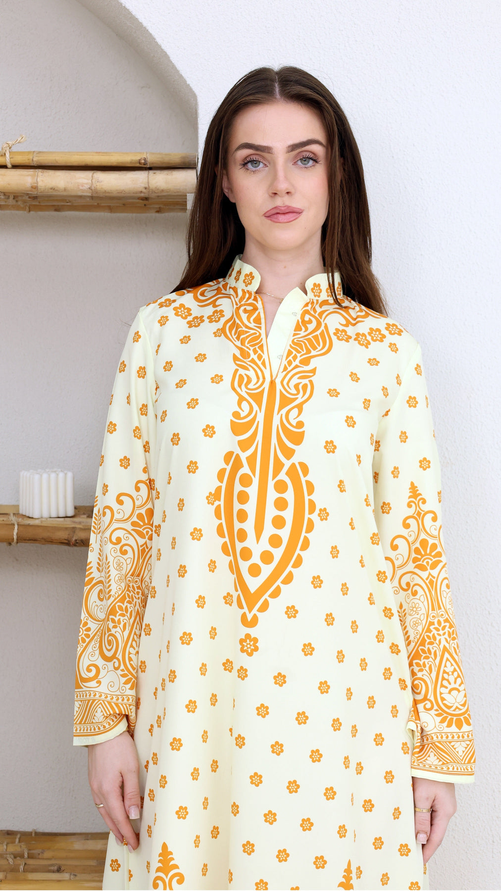 Slip into luxe ease with this kaftan—designed to blend comfort with quiet sophistication. Crafted from premium breathable fabric suitable for all seasons, it drapes beautifully with a soft sheen and breathable feel that moves with you.